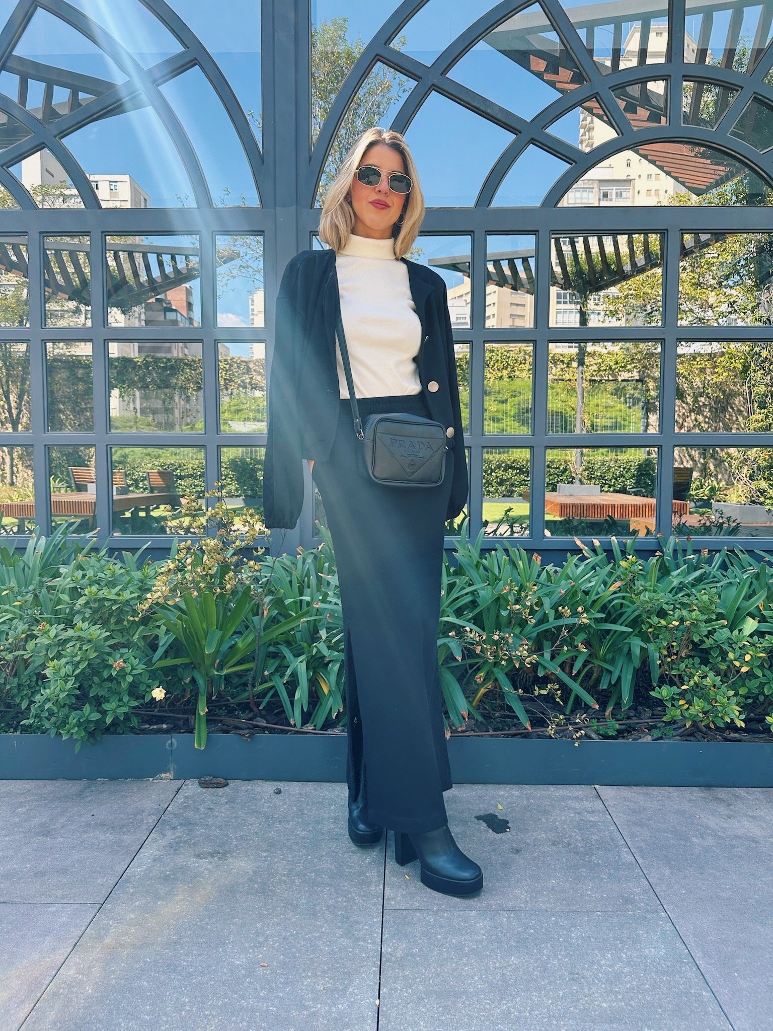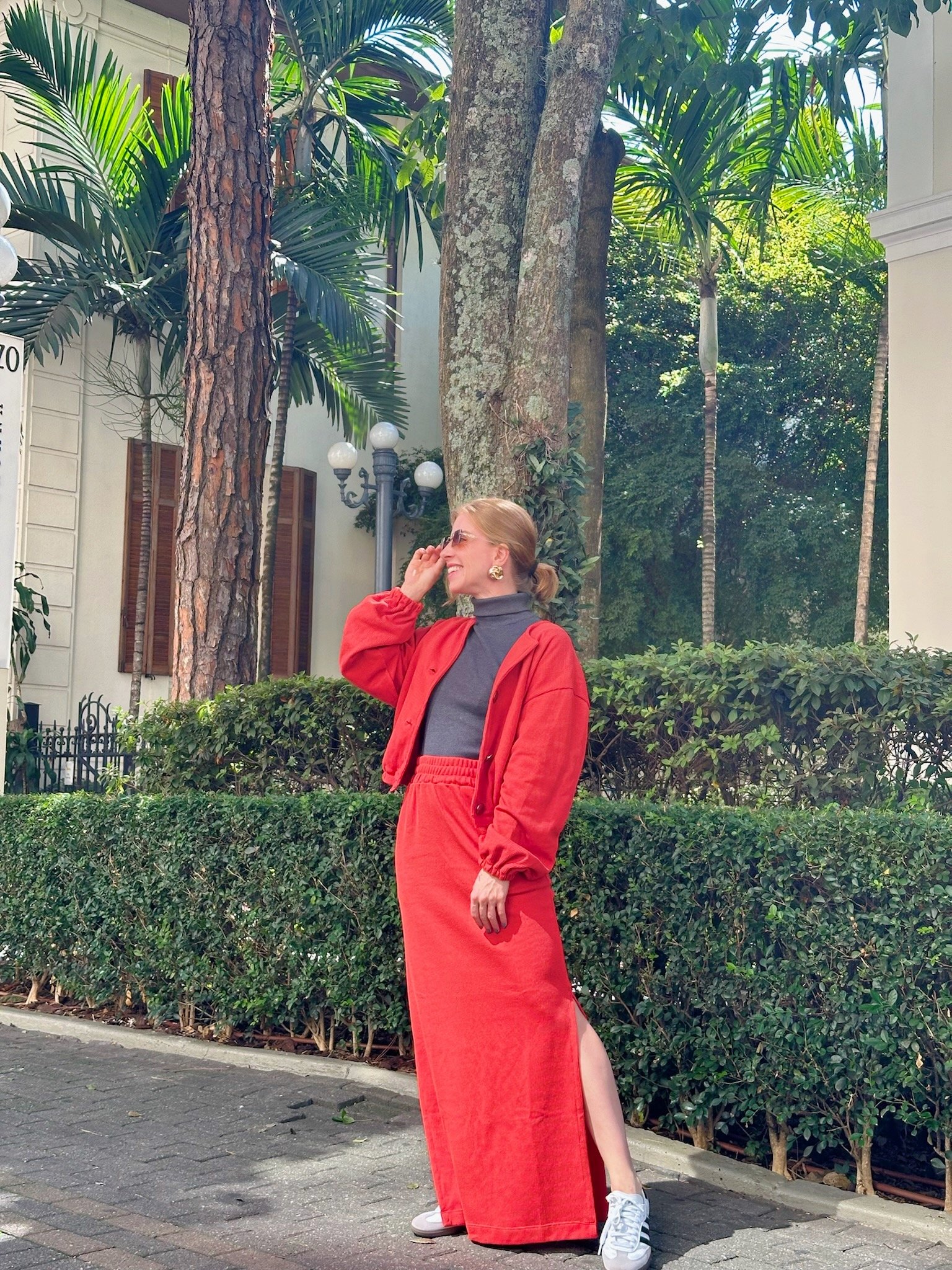 Feita em tecido 100% algodão, com uma trama entrelaçada que lembra um tricô, tem caimento reto, bolso faca e também dois bolsos traseiros. Possui fenda na lateral e elástico no cós. Atemporal, versátil e cheia de estilo, pode ser usada com salto, tênis, bota e meia calça.